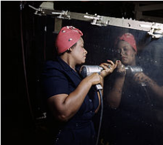 As increasing numbers of husbands, brothers and boyfriends went off to war, women were again required to focus on practicality and support the war effort. Many worked in factories (think of the well-known image of Rosie the Riveter), land armies, nursing and other auxiliary services.